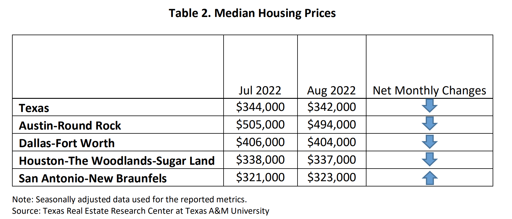 The downward trend for Texas’ median home price continued in August. The state’s seasonally adjusted median price was $342,000, falling more than $10,000 in three months. Prices dropped in all metros except San Antonio, which advanced $2,000 this month (Table 2). Dallas and Houston, Texas’ two largest MSA areas, reported modest declines of $2,000, while Austin took the biggest hit of $11,000. Although housing prices are recently under correction, they remain much elevated from year-ago prices, accelerating 11.4 percent YOY. Even for Austin, the price in this much-affected market was up 5.5 percent YOY.
